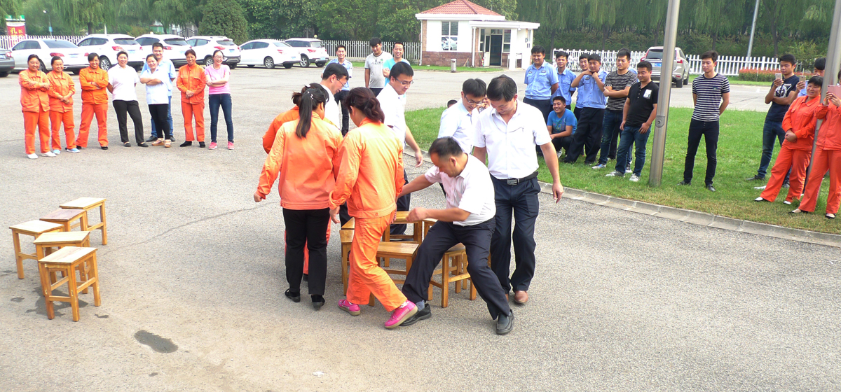 “鉆圈”游戲:每十人一組,排成一隊,大家手拉手,個子由高到低排列。聽到指令后,第一個人立即從腳下拾起呼拉圈套在身上,再從頭上穿出去,將圈迅速套到下一個隊員身上,這名隊員將雙腳從圈中出來后,再如此照舊,依次向后傳遞。該游戲獲勝者:經營部、計劃部、鍍膜部組成的聯隊。
