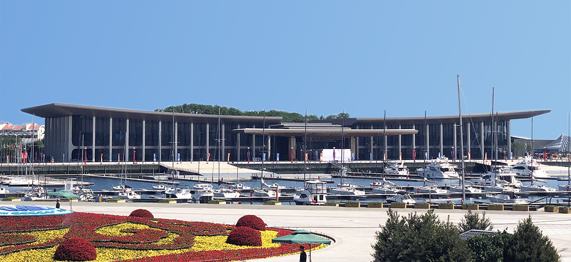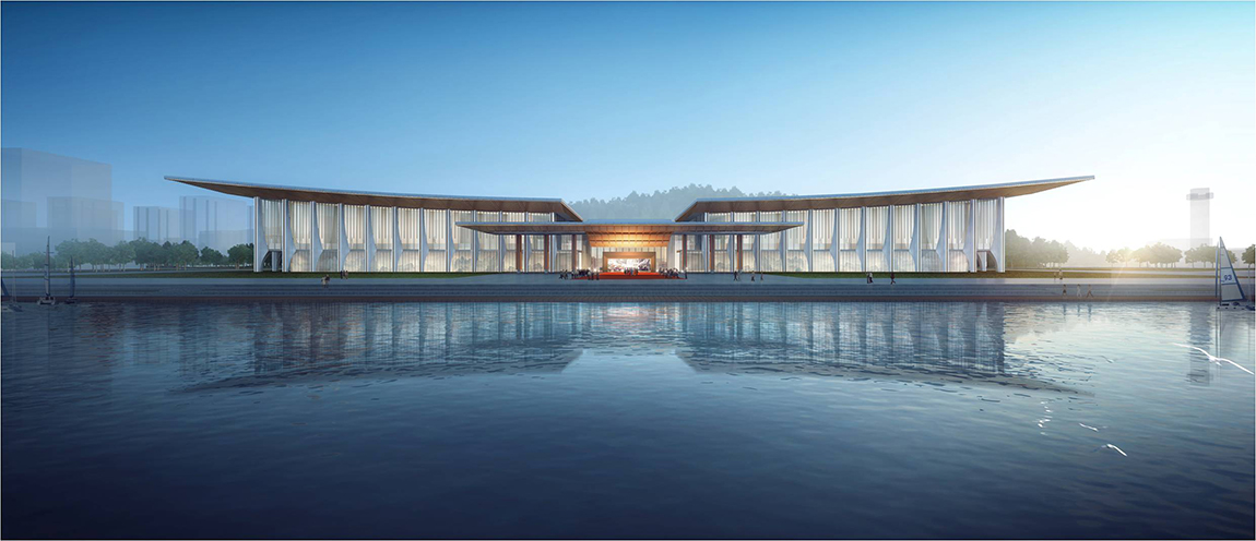 此次會議的主會場位于山東省青島市奧帆中心內(nèi),總用地面積3.1萬平方米,基地南北長約273米,東西寬約70米。主會場的設(shè)計靈感來自青島翱翔的海鷗、海面遨游的帆船,以“騰飛逐夢、揚帆領(lǐng)航”為設(shè)計立意,以抽象、現(xiàn)代的建筑造型傳神再現(xiàn)中國傳統(tǒng)元素與地域海洋文化特性,共同融合成具有獨特性、標(biāo)志性、文化性、生態(tài)性的建筑形體。建筑物遠(yuǎn)看就像一只飛翔在鱗次櫛比的船帆上方的巨大海鷗,通體的超白玻璃幕墻,令賓客與海與山進行互動,感受背山面海、海天一色、藍(lán)綠相映的壯美景象。