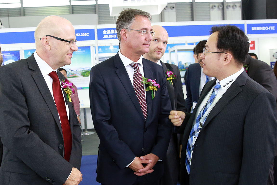 北玻股份玻璃板塊天津玻璃公司、上海玻璃公司、洛陽玻璃公司、北京玻璃公司由北玻股份總裁高理先生帶隊,參加了本次行業(yè)盛會。開幕*天,德國國務(wù)秘書Adler、上海市住房和城鄉(xiāng)建設(shè)管理委員會副巡視員朱劍豪、歐洲門窗協(xié)會會長Hauk先生及夫人以及德國慕尼黑集團Peputy CEO Dr.Reinhard Pfeiffer等組成的龐大代表團來到北玻展臺,高理總裁接待并詳細介紹了公司和此次參展展品的情況,尤其是北玻為幕墻市場帶來的超大鋼化玻璃產(chǎn)品和幕墻設(shè)計的創(chuàng)新空間,得到代表團由衷的贊嘆。